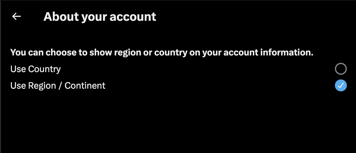 We recommend X users change their location disclosure settings from the default "Use Country" level to the "Use Region / Continent" level, which will reveal an even broader location about yourself. For example, a profile from the U.K. will show "Europe" after making this change. While for many, revealing the country you are in represents a fairly low risk, it remains best practice to reveal as little information about yourself as possible, unless you have a compelling reason not to do so.